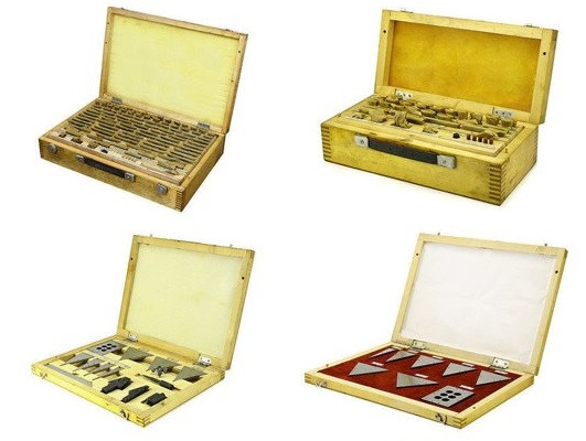 Угловые меры (меры плоского угла) имеют отверстия для крепления приспособлений, стягивающих плитки в блоки. Хранятся меры в специальном боксе, где каждой плашке отведено место, промаркированное размером.
