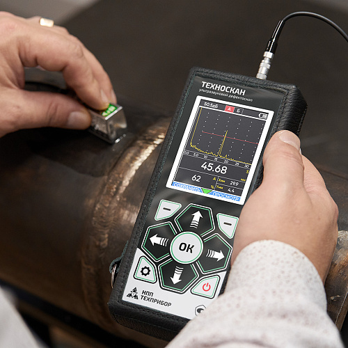 Портативный, полностью цифровой, ультразвуковой дефектоскоп ТЕХНОСКАН общего назначения с массой менее 300 гр. представляет собой простой в настройке и эксплуатации инструмент для контроля в труднодоступных местах и в прочих условиях, когда габариты и вес инструмента являются критичными. Несмотря на малые размеры, обладает хорошим быстродействием, современным морозостойким TFT экраном с тремя цветовыми схемами (в том числе для работы при ярком солнечном свете) и всеми основными функциями современного дефектоскопа: